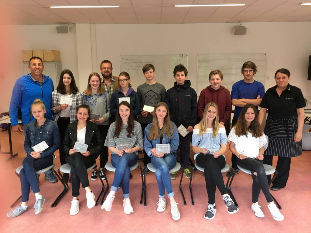 Mit einem Präsent der Firma Lukasch wurden Marvin Reitz, Eric Boes (8a), Eliana Tondar, Hannah Volk (8b), Lucca Konzack, Christopher Körbächer (8c), Paula Hagemann, Venice Henß (8d), Erik Budde, Maik Feldbusch (8e), Lilli Ufer, Vicky Höchst (8f), Marie Butterbach, Leon Angermann (8g) und Madleen Hasilbach und Anneli Schröder (8h) ausgezeichnet. (Foto: pm)