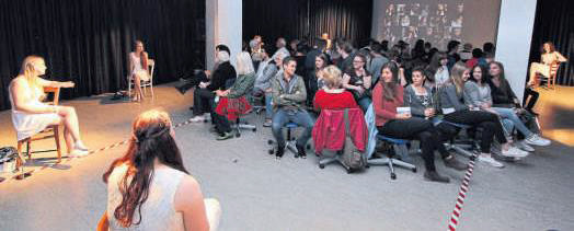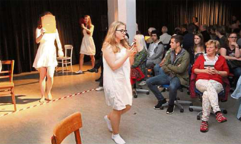 Das menschliche Dasein in verschiedenen Facetten beleuchtete die Theater AG der Theo-Koch-Schule (TKS) unter dem Titel „eigentlich“. Dabei wurde auch das Publikum in die Handlung mit einbezogen und nahm auf Drehstühlen in der Mitte des Raumes Platz. Der Sinn wurde im Laufe des Stückes verständlich, als sich die Zuschauer auf bestimmte prekäre Fragen in einem Quiz, bei dem ehrliche Antworten gesucht wurden, positionieren und auf ihren Drehstühlen auf die jeweilige Seite von Ja und Nein hinrollen mussten. Das Team mit Viola Becker, Mara Geist, Anna Coers, Ria Rampal, Julia Röper, Alena Neudert, Jonas Jochim, Therese Keil und Lucia Fischer-Wasels vermochte es mit leichter Hand, Denkanstöße zu vermitteln und den Theaterabend zu einem Erfolg werden zu lassen. (hgs)/Foto: Schuette