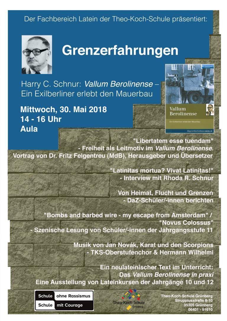 Es geht um den neulateinischen Dichter Harry C. Schnur, der als jüdischer Exilant am 13. August 1961 seine Heimatstadt Berlin besuchte, dort den Mauerbau miterlebte und darüber einen lateinischen Bericht schrieb, das „Vallum Berolinense“. An der Veranstaltung wirken verschiedene Fachbereiche (Latein, Englisch, Deutsch, Deutsch als Zweitsprache) und die Gruppe „Schule ohne Rassismus – Schule mit Courage“ mit. Als Vortragenden konnten wir den Altphilologen MdB Dr. Fritz Felgentreu gewinnen, der das „Vallum Berolinense“ für das Berliner Abgeordnetenhaus übersetzt, kommentiert und herausgegeben hat. Weiterhin wird es ein Interview geben mit Rhoda R. Schnur, H. C. Schnurs Witwe, die eigens zu dieser Veranstaltung aus der Schweiz anreisen wird, Fluchtberichte von DaZ-Schülerinnen und -Schülern und eine trilinguale Lesung (L, E, D) von Schülerinnen und Schülern der Jahrgangsstufe 11. Musikalisch umrahmt wird die Veranstaltung mit Musik von Jan Novák, Karat und den Scorpions.
