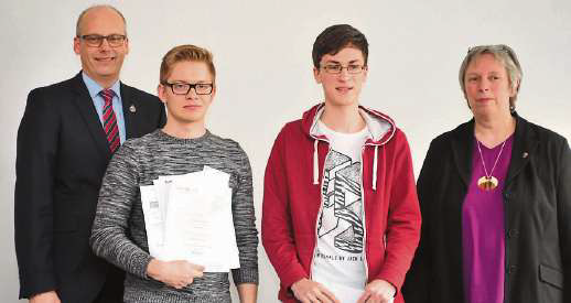 Hartmut Dykmann und Christiane Schmahl zeichneten die Schüler Jannik Scharrenbachund Tobias Ehrenreich von der Theo-Koch-Schule aus. Foto: Wißner