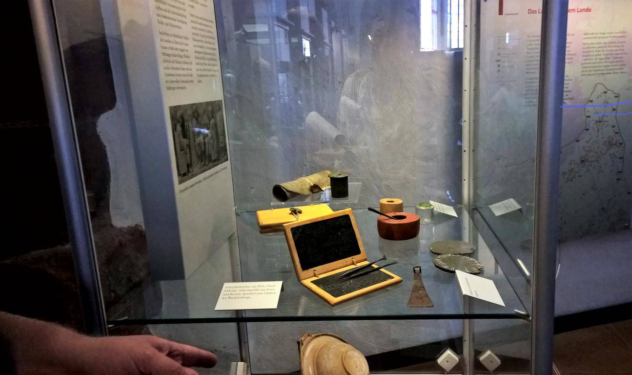 „Latein ist wichtig“, betonte der Archäologe Rudolf Klopfer, der die Schüler/-innen durch die Ausstellung führte. „Man kann es für viele Studiengänge gebrauchen. Außerdem stammen zahlreiche Fremd- und Lehnwörter aus dem Lateinischen. ‚Fenster‘ von lateinisch ‚fenestra‘ ist nur ein Beispiel dafür.“ Dass das Lateinische beim Erlernen weiterer Fremdsprachen hilft, wussten die Schüler bereits: Gefragt, welche romanischen Sprachen sie kennen, zählten sie Spanisch, Italienisch, Französisch und Portugiesisch auf. „Am nächsten am Lateinischen ist das Rumänische“, ergänzte Klopfer. „Es trägt Rom sogar im Namen und besitzt noch etliche Eigenheiten des Lateins, die es in anderen romanischen Sprachen nicht mehr gibt.“