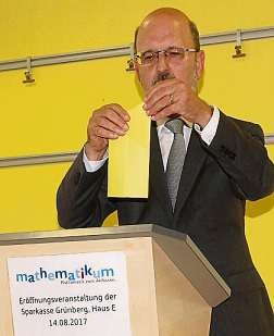 Schulleiter Jörg Keller dankte Prof. Albrecht Beutelspacher und dem die Ausstellung begleitenden Lehrer Marcel Jochim für die Vorbereitung und Unterstützung. Sparkassen-Vorstandsvorsitzende Silvia Linker zeigte sich erfreut, nach vier Jahren wieder eine Ausstellung mit mathematischem Inhalt und mit entsprechenden Erlebnispotenzial in Grünberg präsentieren zu können. Nach dem erfolgreichen Lösen der verschiedensten Aufgaben konnte auch sie feststellen: »Mathe macht glücklich«. Beutelspacher wartete bei seinem Vortrag mit einigen Experimenten auf. Er produzierte mit dem Falten eines Blattes Papier eine Pyramide als platonisches Element. Im Umgang mit Zahlen bezeichnete er diese als die »älteste Kultur der Menschheit«. Das Dezimalsystem mache erst das Rechnen möglich. Mit verschiedenen Malnehmen-Experimenten brachte er den einen oder anderen Anwesenden zum Staunen. Abschließend stellte er fest: »Mathematik heißt immer, wir wollen verstehen«.