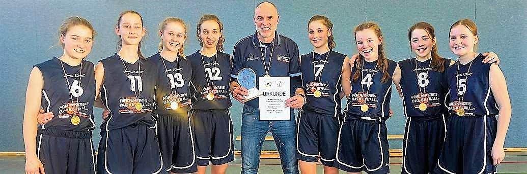 Großer Erfolg für die Basketballerinnen der Theo-Koch-Schule Grünberg beim Landesfinale im Wettbewerb „Jugend trainiert für Olympia“: In der Wettkampfklasse III (Jahrgang 2003/04) qualifizierte sich das Team von Trainer Ralf Römer als Sieger des Landesnetscheids erneut für das Bundesfinale in Berlin. In einem überaus spannenden Finale, mit einem hauchdünnen 19:17 (10:8)-Erfolg gegen die Elisabethschule Marburg sicherte sich das Team das Tickets für das Bundesfinale in Berlin Ende April. „Letztendlich haben wir aufgrund unserer guten Verteidigungsleistung das Spiel zwar knapp, aber verdient gewonnen. Ich bin megastolz auf unser Team“, so der glückliche TKS-Übungsleiter nach dem Finalsieg. In der Wettkampfklasse II (Jahrgang 2001/02) belegte die von Aleksandra Heuser betreute Theo-Koch-Schule nach einem klaren 35:8-Erfolg im „kleinen Finale“ gegen die Ense-Schule Bad Wildungen den dritten Platz. Das Endspiel gewann Turnierfavorit Main-Taunus-Schule Hofheim, gegen die sich die Grünbergerinnen im Halbfinale mit 18:28 geschlagen geben mussten, klar mit 40:18 gegen das Schuldorf Bergstraße. Im Bild das siegreiche Grünberger Team der Wettkampfklasse III mit v.l. Lynn Schmadel, Sixta Herzberger, Alina Straube, Emilia Arnheiter, Coach Ralf Römer, Klara Römer, Shaline Henss, Minette Stark, Lena Kruske. (ebi)/Foto: Spissinger
